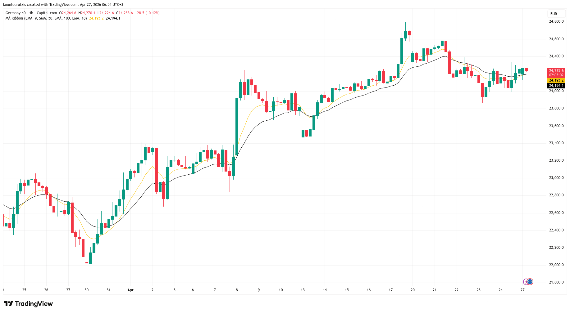 Confirmation to Wait For: For bearish trades, wait for rejection at 1.17500-1.17600 or a clean break below 1.17150. For bullish scenarios, require a 4H close above 1.17600 with strong momentum. Reduce position size significantly on April 30 afternoon and May 1 morning ahead of US data releases. Monitor DXY (Dollar Index) for confirmation - a break above 105.50 would support EURUSD bearish scenarios, while a drop below 104.50 would favor bullish relief rallies. DE40 (Germany 40) AnalysisTechnical SetupThe Germany 40 (DE40) is currently in a recovery phase following a sharp pullback from the recent highs near 24,700. After testing the 24,000 psychological support level on April 23-24, the index has staged a solid bounce, reclaiming the 24,200 level. On the 1-hour chart, the 9 EMA (yellow) has crossed above the 18 EMA (black), and price is trading above both moving averages, signaling short-term bullish momentum. The 4-hour chart confirms this stabilization, with the moving averages flattening and beginning to turn upward, suggesting the selling pressure from the 24,700 rejection is being absorbed. The index is currently consolidating in a “bull flag” or recovery channel structure. The market is attempting to rebuild confidence after the volatility of mid-April. The immediate challenge for bulls is the supply zone between 24,350 and 24,400, which previously acted as support before the breakdown. If this zone is reclaimed, the path opens toward retesting the 24,600-24,700 highs. Conversely, failure to break higher could lead to a retest of the 24,100-24,150 support cluster. Key drivers for the April 27 - May 1 period include month-end positioning flows, which often induce volatility, and the release of Eurozone inflation data (Flash CPI) and US ISM Manufacturing PMI on May 1st. German corporate earnings will also be in focus as Q1 reporting season continues. A stronger-than-expected Eurozone CPI could boost the index, while a weak US ISM print might trigger a global risk-off sentiment, pressuring European equities. Critical LevelsResistance: - 24,350 – Immediate resistance (previous breakdown level) - 24,450 – Major supply zone (confluence of 50 SMA and prior support) - 24,650-24,700 – Recent swing highs (major target for bulls) Support: - 24,150 – Dynamic support (confluence of 9/18 EMA on 1H chart) - 24,000 – Critical psychological floor (April 23 low) - 23,800 – Deep support (aligns with March consolidation) Scenario AnalysisBullish Continuation (Most Likely, 50%) Range-Bound Consolidation (30%) Bearish Rejection (20%) Trade Ideas1. Pullback Long (Primary Bias)