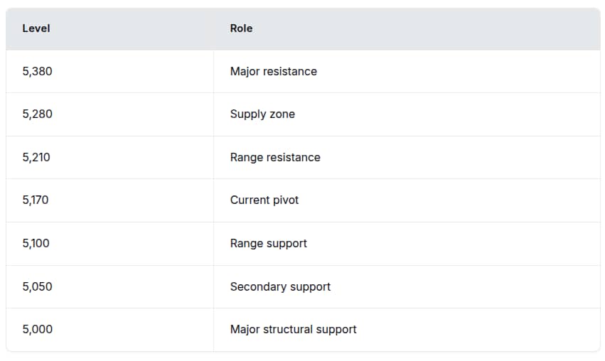 - Bullish Breakout: Sustained > 5,220 → targets 5,280 → 5,350.