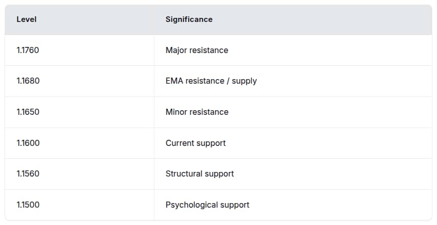- Support: 1.1600‑1.1610 1.1550‑1.1560 1.1500